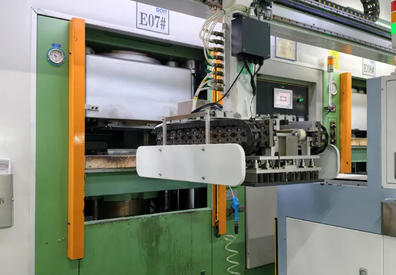 The mechanical arm assembly for automatic cutting and feeding: After the raw materials are processed by slicing and weighing, the gantry mechanical arm moves precisely along the guide rail, sending the raw materials into the mold cavity. The positioning error for feeding is controlled within 0.3mm. The actuator is equipped with the patent for automatic demolding of finished products: When the vulcanization molding is completed, the gantry assembly drives the mechanical arm assembly to extend forward, and the product is blown off by the wind and falls into the frame at the back, completing the non-contact demolding process. The entire process does not require manual approach to the mold cavity. The multi-station adaptability of rigid guide rails: The gantry structure of the model can be linked with two forming molds, and the mechanical arm can switch the working position as needed, solving the limitation of "single mold, single production" of traditional equipment.